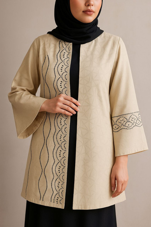 اگر به دنبال یک مانتوی مجلسی شیک هستید که هم وقار داشته باشه و هم نگیندوزیهای ظریفش بدرخشه، این مدل انتخاب بسیار مناسبیه.